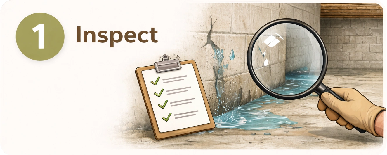 Walls and floors must be clean and free of active leaks. If water is entering, waterproofing must be completed first.