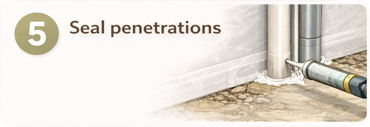Utility openings and transitions must be sealed to maintain a continuous moisture-control layer.